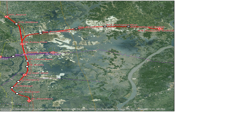 •  নগর এলাকাতে বিমানবন্দর হতে কমলাপুর পর্যন্ত মেট্রোরেল আন্ডারগ্রাউন্ড দিয়ে যাবে (১৬.৪ কি.মি.)